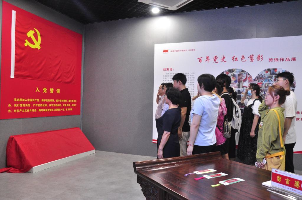 为庆祝中国共产党成立100周年,大力营造爱党信党跟党走的浓厚氛围。6月25日下午,我院党员代表在党委书记李光新的带领下于文博南楼汉字文化体验馆西厅参观“百年党史,红色剪影”剪纸展并重温入党誓词。