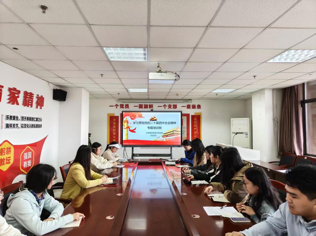 为深入学习贯彻党的二十届四中全会精神, 3月26日至3月27日,我院学生第三党支部于文博北楼612 A会议室举办“学习贯彻党的二十届四中全会精神”专题培训班。培训班由党支部书记赵蒙蒙主持,党支部全体党员参加。