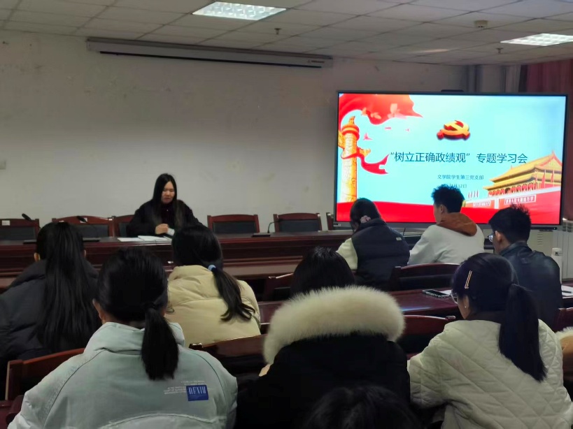 为深入学习推进树立和践行正确政绩观学习教育工作,3月12日,我院学生第三党支部在文博北楼612B会议室开展树立和践行正确政绩观学习教育会,此次学习会由党支部书记赵蒙蒙主持,支部全体党员参与。