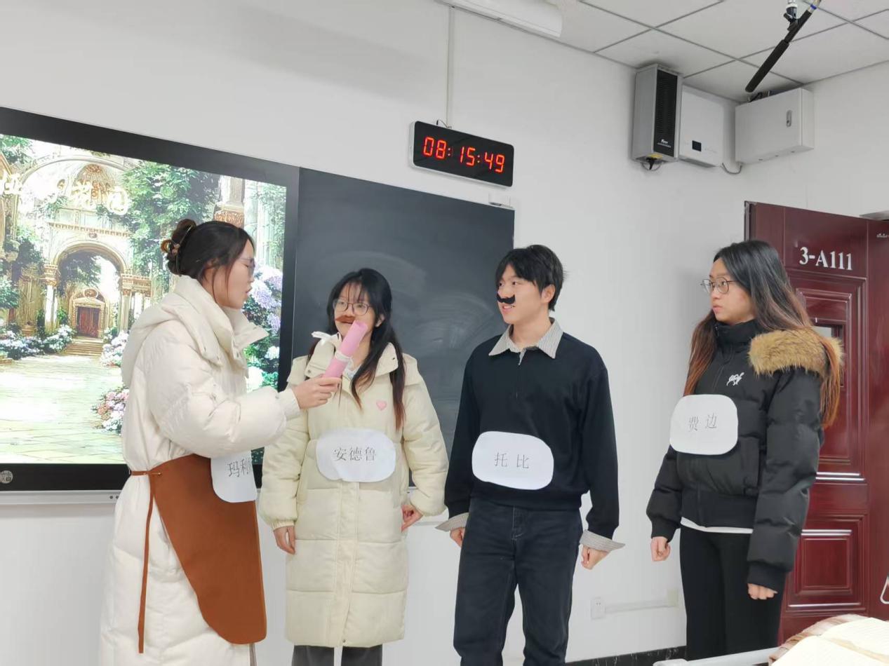 12月10日上午,在明园校区3-111教室内,2023级汉语言文学专业1班在徐艺玮老师的指导下,将外国文学课堂转化为文艺复兴时期的“微型剧场”,成功举办了一场莎士比亚戏剧精彩片段展演活动。